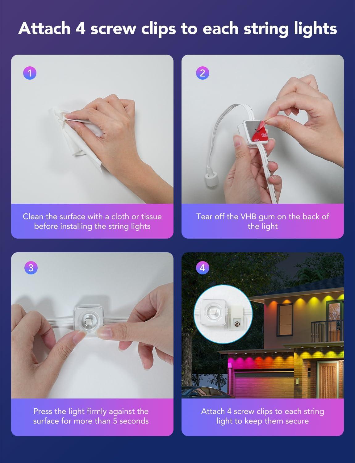 Simple Installation: After attaching the permanent outdoor lights with VHB glue on the roof, install the clips on both sides of the lights and secure the clips with the screws provided.