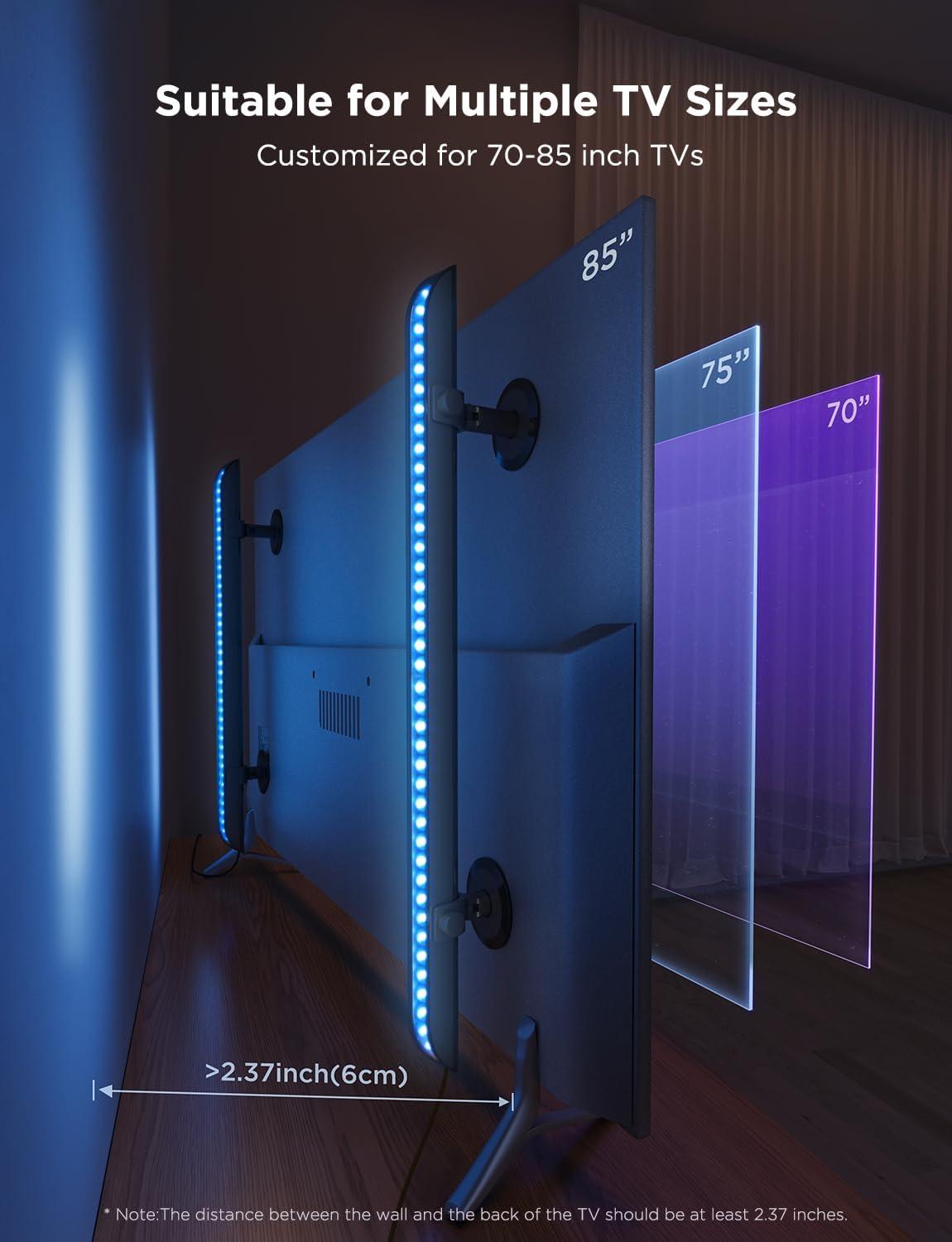 Suitable for Multiple TV Sizes & various placements : The Govee tv led backlights fit TVs from 70 to 85 inches. The led light bars can be attached to the back of the TV, lay flat on TV cabinets, or inserted into the bases to freely stand